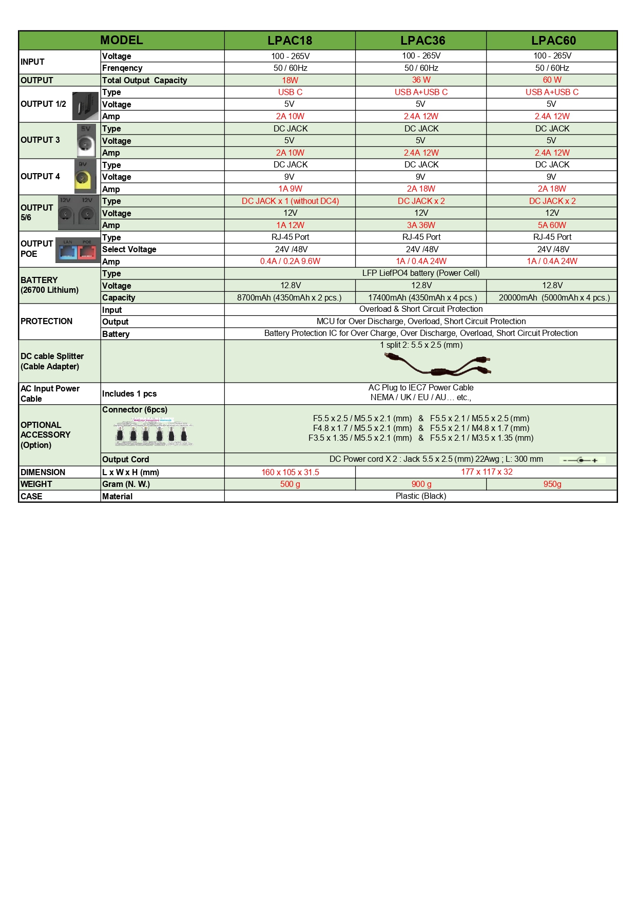 * Support 18W or 36W or 60W output